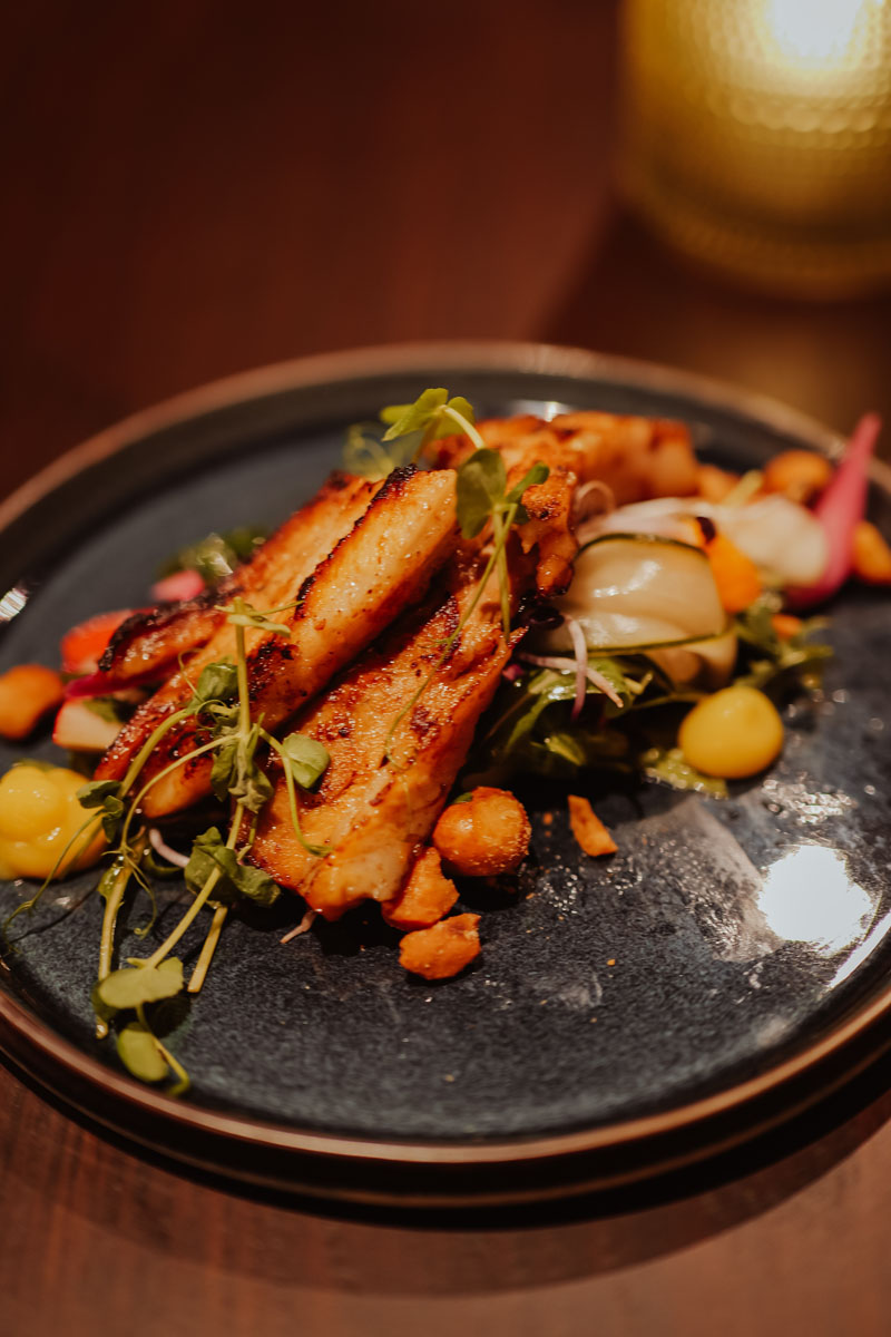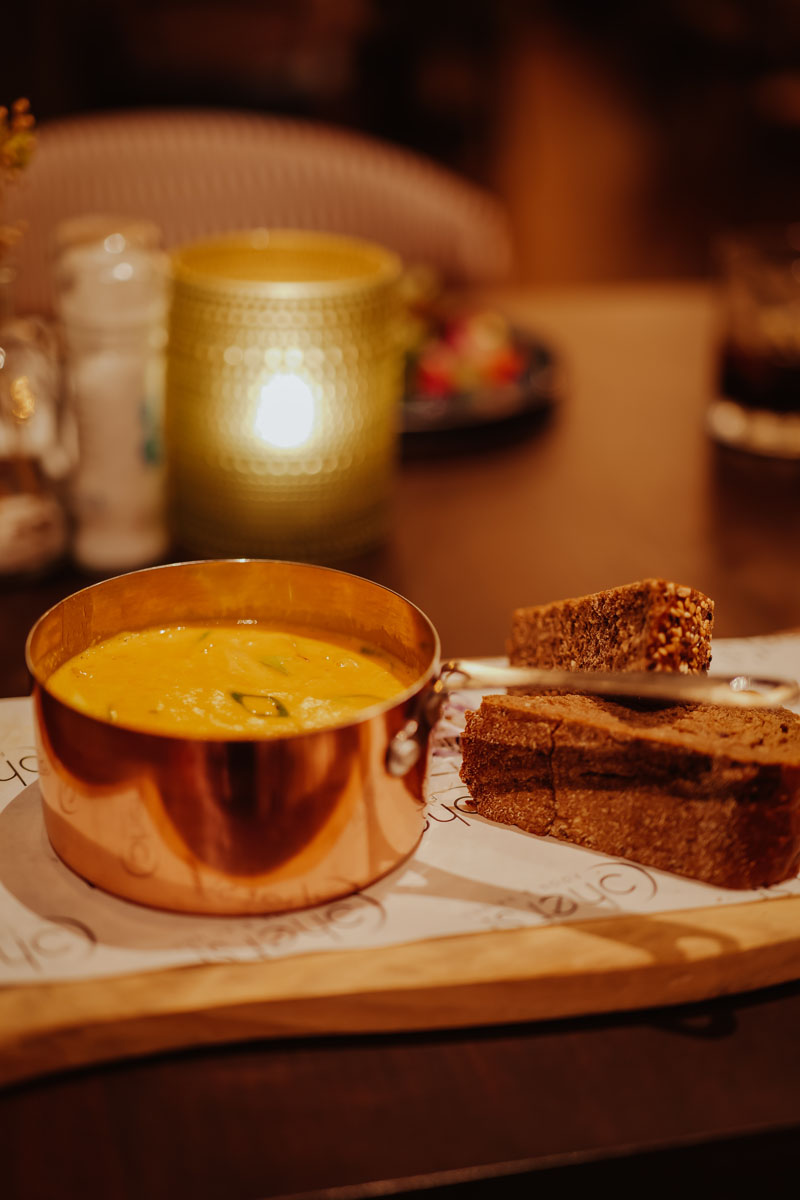 Het restaurant, gelegen in het Leonardo hotel, is kleinschalig opgezet en kent een moderne inrichting met open keuken. De kaart is divers, wat ervoor zorgt dat er voor ieder wat wils is. Zo begonnen wij met een pompoen-curry soep en buikspek. Allebei hele verschillende gerechten, maar onwijs goed en zo smaakvol!