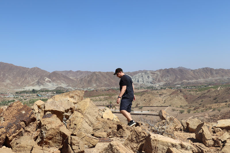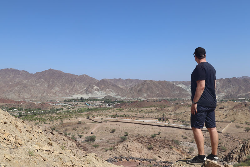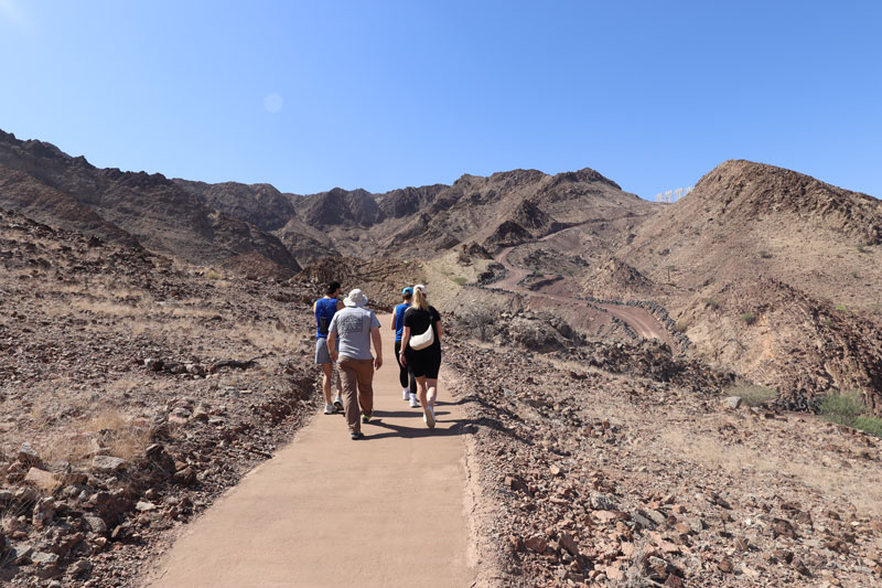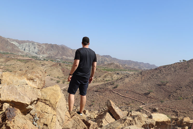 Eenmaal aangekomen in Hatta, begint het avontuur bij Hatta Wadi Hub, een centrum voor outdooractiviteiten. Hier ontmoette ik David Charlton, die ons begeleidde tijdens een hike naar de iconische “Hatta”-letters. Deze enorme witte letters zijn tegen een berg aangelegd en vormen een van de bekendste bezienswaardigheden in Hatta. De hike ernaartoe is geschikt voor verschillende niveaus, hoewel een basisconditie wel handig is. Het pad voert je door ruige rotsformaties en biedt onderweg prachtige uitzichten over het berglandschap.