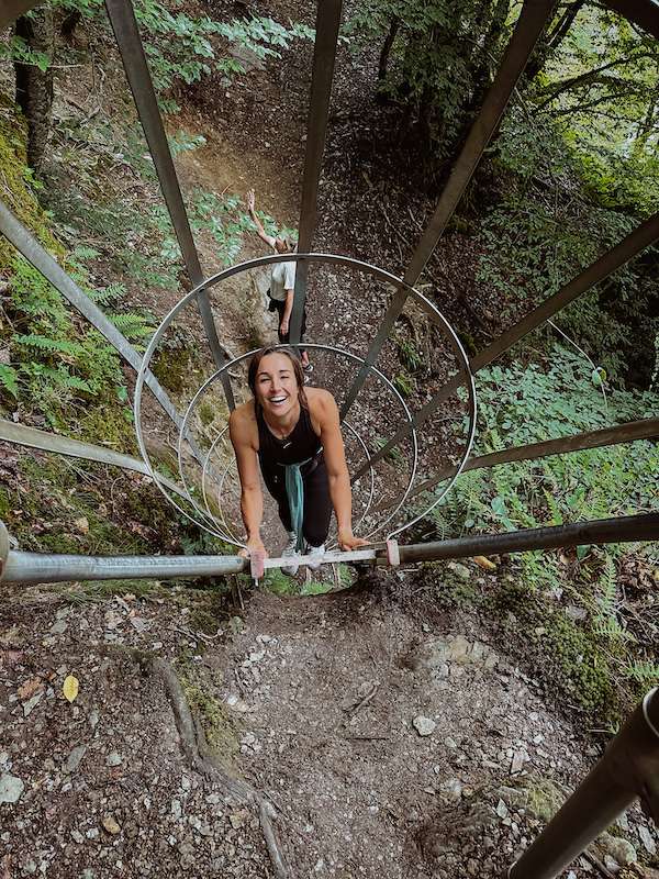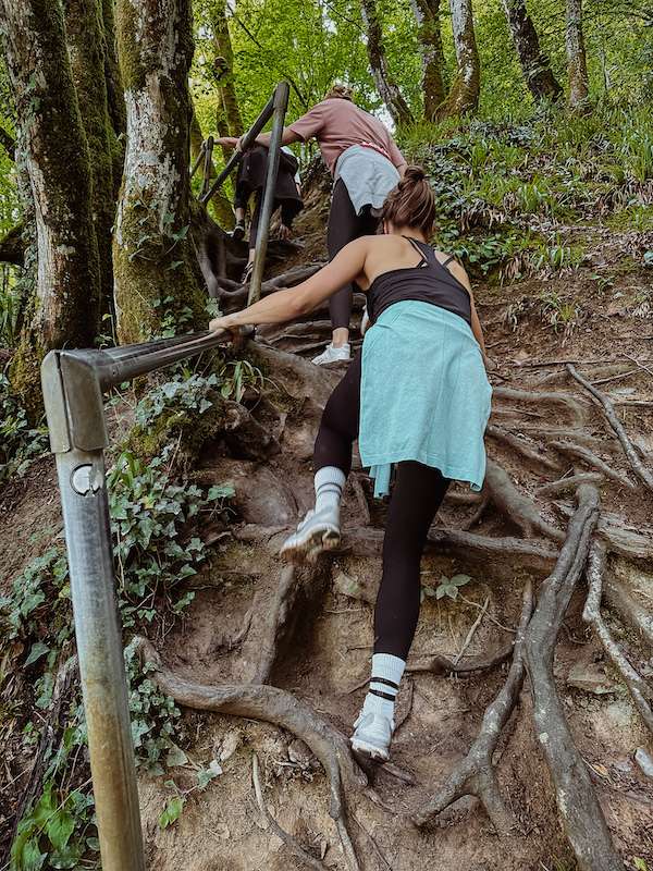 In het dorpje staan al bordjes waar je heen moet voor het startpunt van de laddertjeswandeling. De route begint pas echt bij het waarschuwingsbord: ‘gevaarlijke wandeling, af te raden voor gevoelige personen’. Dit is niet helemaal goed vertaald uit het Frans, hier wordt mee bedoeld dat de wandeling gevaarlijk kan zijn voor jonge kinderen, zwangere vrouwen of mensen die slecht ter been zijn. Ook met hoogtevrees is deze wandeling niet zo geschikt. Je gaat hierna al meteen een steile trap af die bestaat uit boomwortels. Met deze spannende trap weet je meteen wat je de komende route te wachten staat.